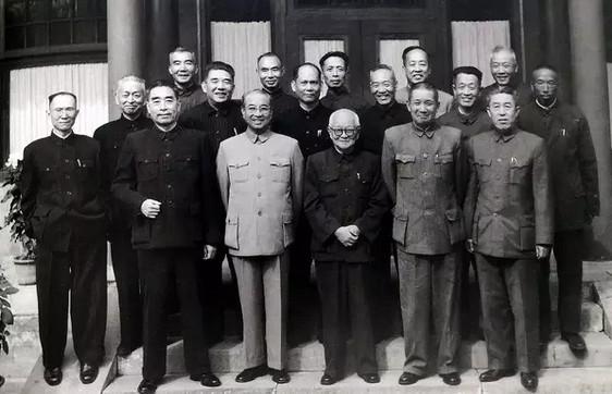 1960年代,周恩来同陈赓与原国民党军政人员合影(前排左起:周恩来、陈赓、邵力子、张治中、郑洞国;二排左起:李奇中、黄维、唐生明、覃巽之、侯镜如、杜聿明、周振强;三排左起:王耀武、杨伯涛、郑庭笈、周嘉彬、宋希濂)