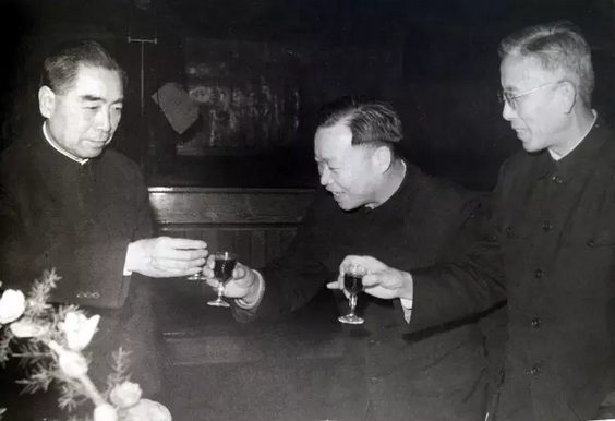 1962年1月5日,周恩来与科学家钱三强、周培源在茶会上