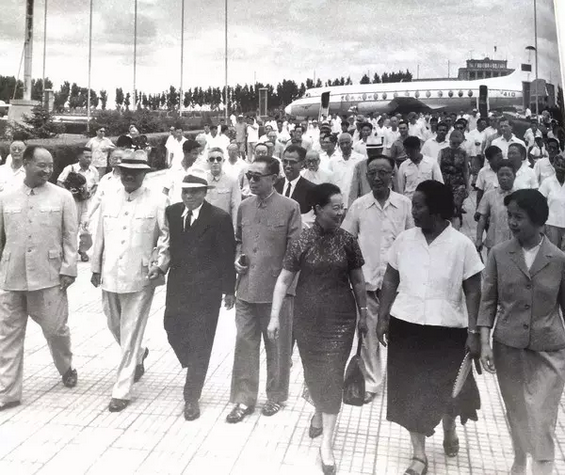 1965年7月20日,周恩来同彭真、贺龙、郭沫若等在首都机场欢迎前国民党政府代总统李宗仁先生和他的夫人郭德洁从海外归来