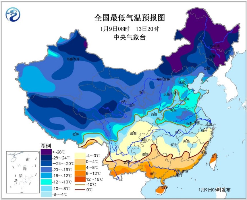 人民网北京1月9日电 据中央气象网站消息,中央气象台1月9日06时继续发布寒潮黄色预警: