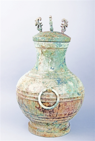 此件青铜锺,2003年出土于乌杨新田湾墓群四号汉墓。铜锺通高59.5厘米,口径18.3厘米,底径22厘米,重6.95千克;侈口,束颈,丰肩,鼓腹,圈足;盖与口子母相扣,盖顶饰三枚相背而立的凤鸟形立钮,肩部有对称兽面纹衔环铺首,颈部、肩部、腹部各施三道凸弦纹。