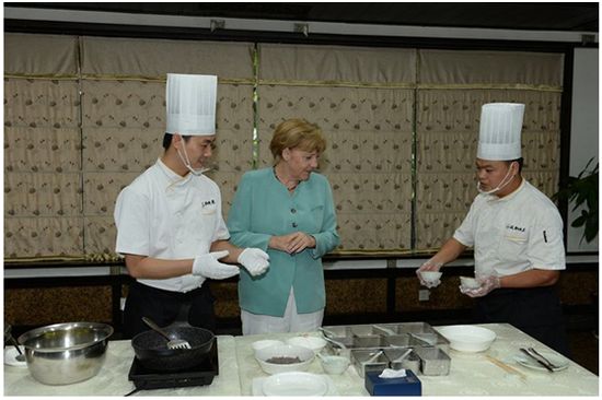 "小心,别给女总理太多辣椒!""默克尔拜访熊猫故乡"……作为中国常客的德国总理默克尔,在访华时去的地方要比别人多得多。2014年7月,当默克尔访问成都时,德国媒体掀起一股"成都热"。默克尔逛农贸市场的一幕,尤其让德媒津津乐道:默克尔掏钱买了一小袋郫县豆瓣和一些八角;逛了近20分钟菜市场后,又来到一家川菜馆,在大厨指导下"学习"宫保鸡丁制作;她一个人就吃了一盘宫保鸡丁的1/4。
