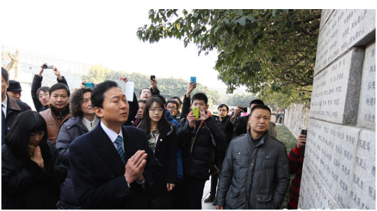 2013年1月17日,日本前首相鸠山由纪夫在侵华日军南京大屠杀遇难同胞纪念馆遇难者名单墙前祭奠遇难者。某种意义上,南京对于日本首相既是敏感的"禁地",也是一些日本人士眼中对华"最大和最后的王牌"。