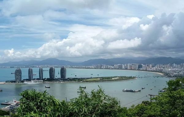 在三亚湾的东南方向,鹿回头风景区的北面,几座状如贝壳的巨大建筑矗立在一座人工岛上,这是三亚市的著名地标——凤凰岛。