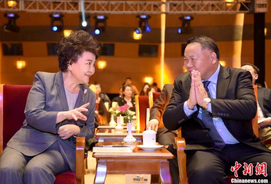 1月10日,由中国新闻社主办的“2017全球华侨华人年度评选”颁奖典礼在北京举行,“2017全球华侨华人十大新闻”在现场揭晓,国务院侨办主任裘援平出席颁奖典礼。图为裘援平(左)在典礼会场与新闻人物当选代表、巴拿马共和国总统顾问陈国基交流。中新社记者侯宇摄