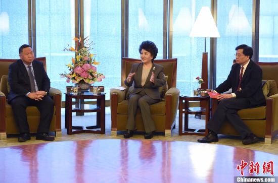 1月10日,“2017全球华侨华人年度评选”颁奖典礼在北京举行,国务院侨务办公室主任裘援平(中)在典礼前会见陈国基(左)等“2017全球华侨华人新闻人物”当选代表。中国新闻社社长章新新(右)参加会见。中新社记者侯宇摄