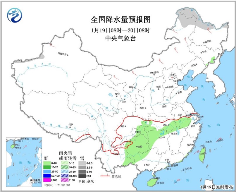 人民网北京1月19日电 据中央气象台网站消息,18日,新疆西北部、黑龙江西北部等地部分地区出现小雪。19日晨,河北南部、山东西部、河南大部、江苏中北部、安徽东北部、湖北中部、重庆西南部等地出现能见度不足1千米的雾,局地能见度不足200米。