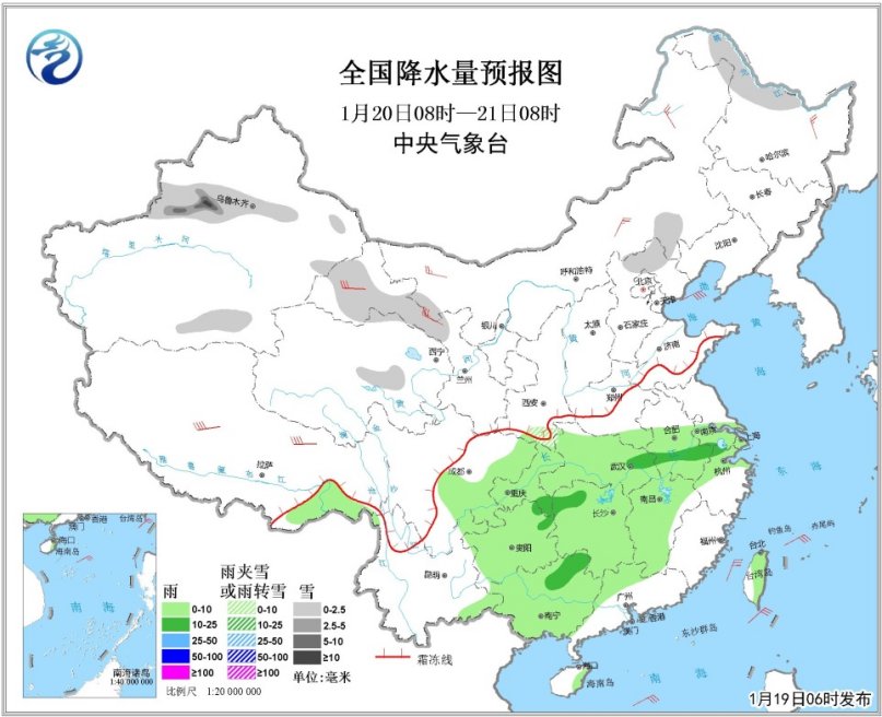 19日08时至20日08时,内蒙古东北部、黑龙江西北部等地的部分地区有小雪或阵雪;西南地区东部、江南北部、华南东部沿海、广西西部、海南岛、台湾等地有小雨。内蒙古、黑龙江北部等地有4~5级风(见图2)。
