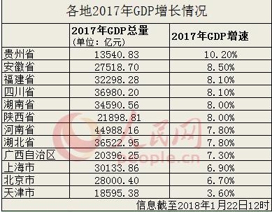1月18日国家统计局公布数据,2017年全年国内生产总值(GDP)总量82.71万亿元,首次突破80万亿元大关;按可比价格计算,GDP比上年增长6.9%。以此为参考,已公布2017年GDP增速的12省份中,除京津沪之外,全部高于全国平均水平6.9%。其中贵州省地区生产总值达13540.83亿元,比上年增长10.2%,增速高于全国水平3.3个百分点,稳居榜首;安徽、福建、四川、湖南、陕西5省GDP增速亦均突破8%。