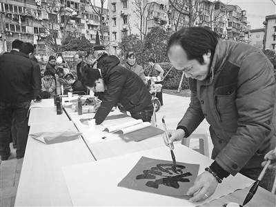 1月20日,农工党江苏南通市文教总支委员会送温暖进社区活动在虹桥社区虹桥新苑广场举行。本次“文化惠民文化乐民文化为民”活动由农工党文教总支、虹桥街道、虹南社区联合主办,虹桥书画院协办。图为农工党党员书法家们为闻讯前来的街区百姓挥毫泼墨,书写喜气洋洋的春联和大红的“?!弊??;歧?摄影报道