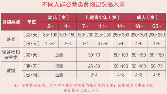 膳食指南推荐成年健康人群的膳食应该“食物多样、谷物为主”,每人每天应该摄入主食250~400 克,其中全谷物和杂豆类50~150 克,新鲜薯类50~100 克。
