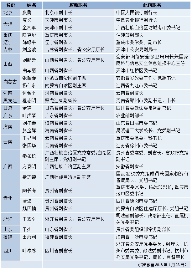 新华网北京1月24日电(记者陈淑君 李志强)2018年省级地方两会大幕开启,多地党政领导班子近日迎来密集调整。1月19日到23日,重庆、广西、甘肃等地省级党委常委班子成员陆续调整,北京、天津、内蒙古、辽宁等十九省区市28位省级政府副职履新。