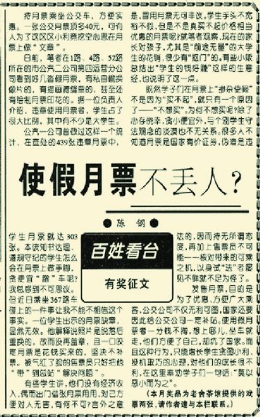 在查获的假月票中,有私自偷换相片的,有描画骑缝章的,还有绘制月票印花的。而违规使用这些月票的人当中,学生占了很大比例,尤其是大学生。市公汽一公司曾做过统计:在查处的439张违规月票中,学生月票就达303张。本报1998年4月30日6版《使假月票不丢人?》一文专门对这种现象提出批评:发售月票,目的是为了优惠、方便广大乘客,公交公司不仅无利可图,国家还要因此给公交公司一定补贴。使用假月票者一分钱不掏,想上哪儿,坐车就走,他们方便了自己,却坑了国家。而且这种行为,只能增长学生贪图小利、投机取巧的心理,对他们的成长很不利,在这里奉劝学子们一句话:“莫以恶小而为之?!?/p>