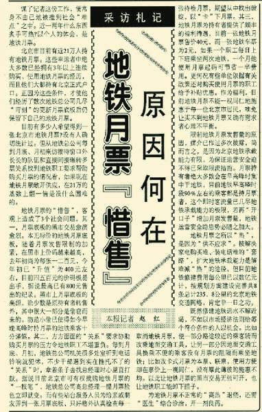 公交地铁联合月票一票难求,方方面面的“关系”要求协助购买月票的压力令地铁职工不堪重负。每到月底、月初,地铁总公司机关很多处室听到电话铃响就犯怵,不少干部遇到实在推托不了的“关系”,拿着条子去找总经理时心里直打鼓。据说当时北京市可有权批购这种月票的“一支笔”、地铁总公司的总经理一提月票脸色立即就变。而有些站台服务人员为给亲戚朋友弄到一张月票底板,只好格外认真检查每一张待检月票,期望从中找出破绽,以“卡”下月票。(1996年10月16日《北京日报》2版,《地铁月票“惜售”原因何在》)
