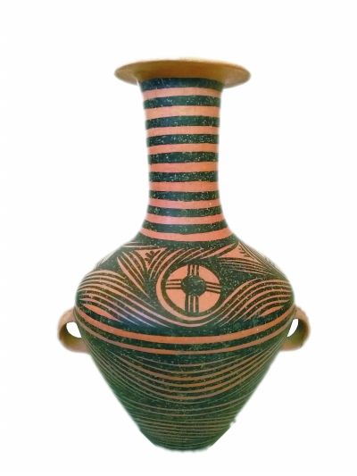 在我收藏的彩陶中,意外的惊喜当属一件高约六十厘米的彩陶瓶。此件器物形体高大,打磨光滑,器身的黑彩绘有漩涡纹、水波纹、十字漩纹。纹饰布局严谨,色彩明快,线条流畅,是马家窑文化的代表。在古玩店里初见时由于商家开价过高未能如愿,几个月之后,商家来电话,说回家过年等钱用,可以考虑低价转让。最终天遂人愿,皆大欢喜。