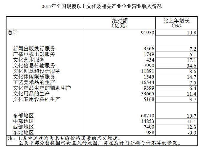 据对全国规模以上文化及相关产业5.5万家企业调查,2017年,上述企业实现营业收入91950亿元,比上年增长10.8%(名义增长,未扣除价格因素),增速提高3.3个百分点,继续保持较快增长。