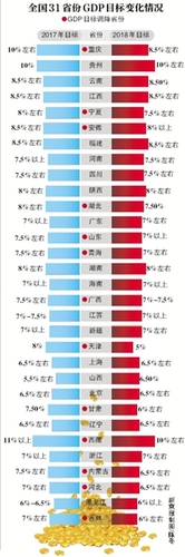 另外,还有部分省份调整了具体表述。如广东将去年的7%以上改为7%左右,河南将去年的7.5%以上改为7.5%左右。不过,也有一些省份与2017年一致,如北京、上海这两年目标均为6.5%左右。