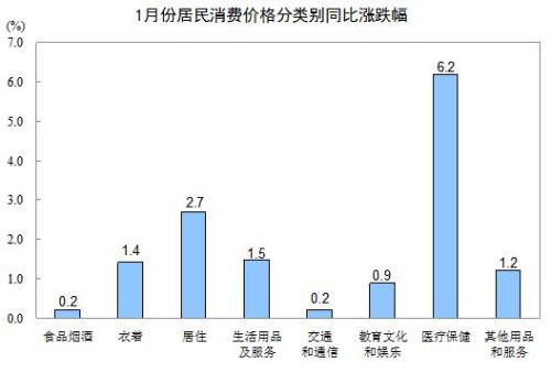 其他七大类价格同比均上涨。其中,医疗保健、居住、生活用品及服务价格分别上涨6.2%、2.7%和1.5%,衣着、其他用品和服务价格分别上涨1.4%和1.2%,教育文化和娱乐、交通和通信价格分别上涨0.9%和0.2%。