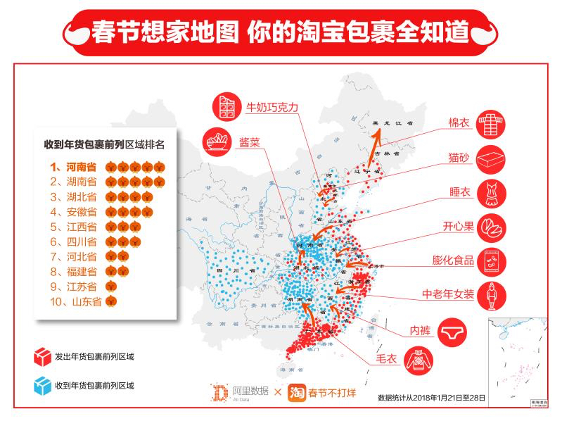 据阿里数据显示,2018天猫年货节期间,在广东学习生活工作的异乡人寄回故乡的包裹最多,遥遥领先于排名二三的浙江省和北京市。这些装着毛衣,棉服,芒果干的包裹被发往了他们的家乡湖南,湖北,广西壮族自治区等,小小的包裹承载了浓浓的思乡情。