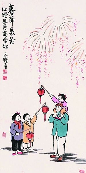 近现代画家中有不少人在新中国成立后都创作过年节题材的作品,丰子恺在其中算是比较多产的一位。中国外文局所属的海豚出版社曾经出版过两册《丰子恺新中国漫画》,其中一册名为《惜春华》,里面收有诸多年节作品。丰子恺的年节新画主要包括《春节小景》《迎春爆竹响千家,共祝新春百物华》《除夜美景》《元旦小景》《第一个炮仗放得响》《春节贺新生》《除夜生的小弟弟,过了一夜长一岁》《欢乐的恐怖》《除夜点红灯,明年大跃进》《春节美景》和《恭贺新禧》等。在画于1961年2月的《春节贺新生》中,他题写道:“春节欢庆夜,娇儿呱呱生。生后刹那间,两眼如明星,应是逢盛世,急欲看太平?!鄙乇泶锪说笔钡南苍眯那?。