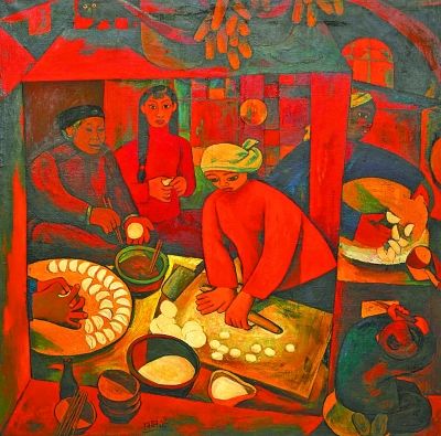 书家手写的春联,一向是广受欢迎的新年礼物。范文阳的中国画《春满人间》描绘的正是手写春联的情形。画中有两位书法家正在伏案走笔,十多名群众已经拿到了写好的春联、福字,还有一些人正在桌旁等候。近年来,每到春节,全国各地的书法家便在文联、书协等单位的组织下纷纷深入到基层,为群众写春联、送福字,将浓浓的年味儿送到老百姓身边?;鳌洞郝思洹氛切率贝笆榉ń蚣摇被疃恼媸敌凑?。