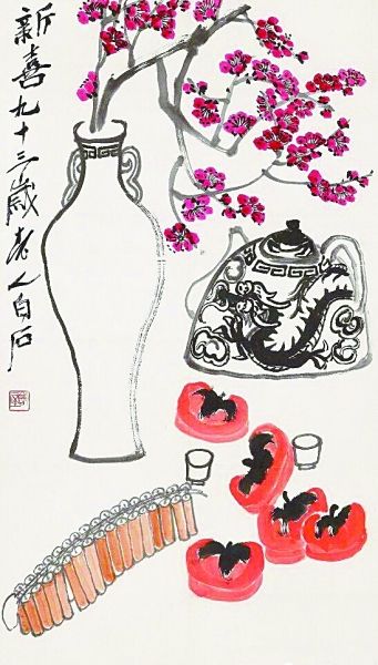 在齐白石笔下,传统的“岁朝图”便更多了些世俗烟火之气。众所周知,齐白石有一套本事,便是为“万虫写照,百鸟传神”,许多在前人看来不入画的东西在他的作品里都有表现。其《岁朝图》也是如此,牡丹、水仙、柿子这些吉祥花果在他的画里依然常见,而前人少画的灯笼、爆竹、茶壶等物什也成了他画里的主角。且看齐白石作于93岁的《岁朝图》,瓶中几枝红梅娇艳可人,再配上几颗红柿子、一串红爆竹、一只龙纹壶、两盏素茶杯,既有吉祥如意之愿,又有日常生活之趣,寻常百姓家的年味儿跃然纸上?;狻靶孪?九十三岁老人白石”,足见画家当时的喜悦心境。是年,北京文艺界专门为齐白石召开祝寿大会,周恩来总理亲自出席宴会,对这位画坛耆宿给予了极高的礼遇。可见,齐白石此幅《岁朝图》不但接地气、有年味儿,更寄托了古木新枝、老当益壮的美好愿景。