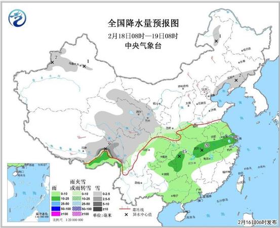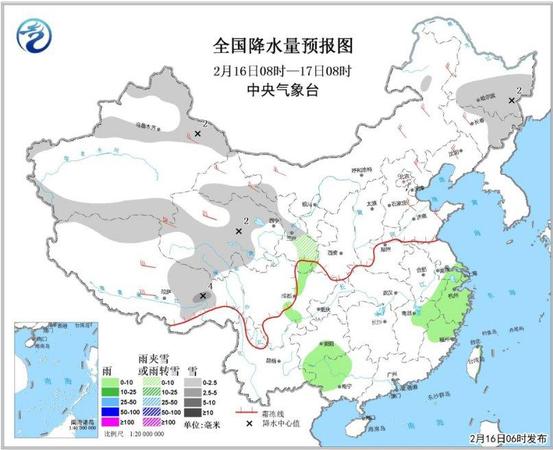 图1 全国降水量预报图(2月16日08时-17日08时)