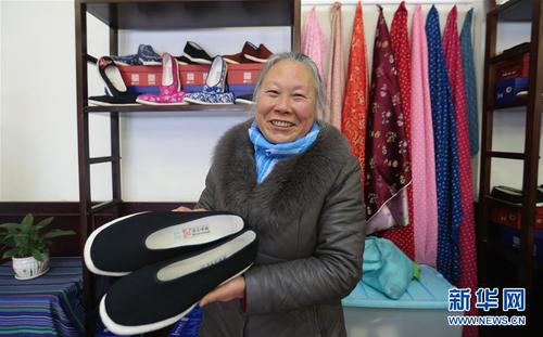 在郫都区战旗村,成都市非物质文化遗产“唐昌布鞋”传承人赖淑芳在展示布鞋(2月12日摄)。新春佳节来临之际,中共中央总书记、国家主席、中央军委主席习近平来到四川调研,看望慰问各族干部群众。从巍巍大凉山到青青映秀镇,从车间到村头,总书记的殷殷关切让各族干部群众感到家人般的温暖,对美好生活更加充满信心。新华社记者 江宏景 摄
