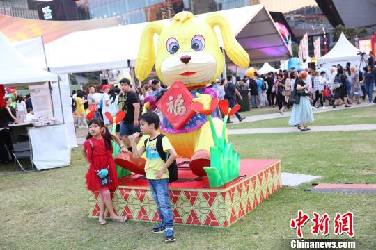 狗造型彩灯吸引游人合影留念。陶社兰摄