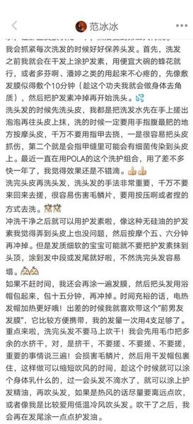 这个帖子,由范冰冰发布在某美妆分享类APP上,她详细地介绍了自己洗发护发的全过程和小细节。简单来说,就是护发素-洗发水-护发素(发膜),被网友称为“三明治”洗头发。