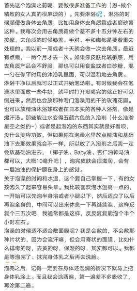 这里给大家划一下重点,先淋?。ü讨腥ソ侵剩排D蹋ǜ擅倒寤ò昊蛉朐〖粒停?0ml左右)——开始泡澡——先泡半身再泡全身——泡澡过程中(喝红酒、吃水果补充水分、放音乐增加仪式感,放松自己,敷面膜)——半个小时左右泡澡完毕—身体乳涂两遍。
