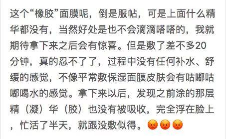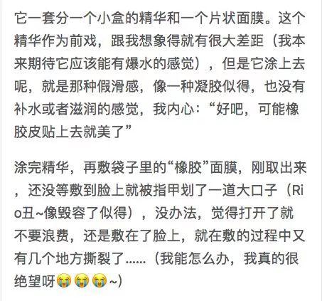比如,某韩国品牌大火的“橡胶面膜”,包装看上去很高科技,但实际上并不好用。范冰冰本来期待会有“爆水感”的精华,涂上脸却是假滑的凝胶感,另一片“橡胶面膜”则超级容易撕裂。