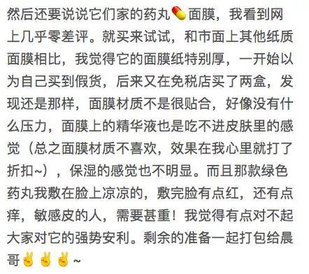 同品牌的另外一款很火的“药丸面膜”,范冰冰当然也买来试了,面膜材质不符合她的预期,效果似乎也不咋地,敷完脸还有点红痒,“吓”得她准备把剩下的面膜全打包给李晨。