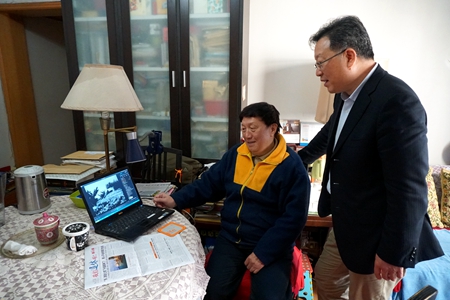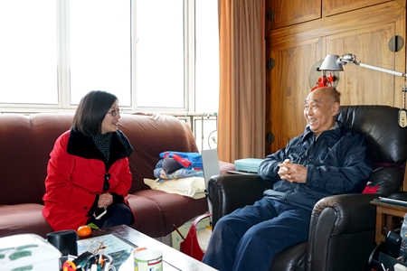 踏入彭镇秋的家中,沈永铭和陪同看望的工作人员就被电脑中正在播放的纪录片所吸引。这部摄于1964年3月的纪录片《连队文艺之花》,内容取材于当年彭镇秋所在部队的真实生活,他还亲自担任了编剧并在影片中出演。彭镇秋兴致勃勃地向大家介绍了影片的拍摄过程,忆起往昔岁月,感叹新时代所带来的新变革。沈永铭简要介绍了市委的各项工作,详细询问了彭老的饮食起居,反复叮嘱他最近气温较低,要合理饮食,注意保暖,并代表市委向他拜早年。