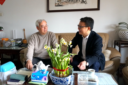 朱德瀛家中阵阵幽香沁人心脾,一盆盆盛开的水仙将家中点缀得春意盎然。汪胜洋向他致以节日的问候,介绍了最近市委开展调研工作的重点,以及市委通过创新方法、优化平台以提升会员参与度、提高参政议政水平一些新的工作构想,还就当前社会经济发展中的热点问题听取老同志的建议,汲取思路。朱德瀛就当前民生热点侃侃而谈,对市委领导专程前来看望表示感谢,并祝愿市委各项工作取得新的成绩。