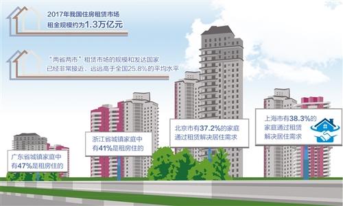 租赁占比高是大城市住房市场的典型特征,因为租赁需求在大城市表现较为明显。住房与城乡建设部政策研究中心主任秦虹列举了一组数据:两省两市租赁市场的规模和发达国家已经非常接近?!傲绞 笔枪愣『驼憬。钦蚣彝ブ蟹直鹩?7%和41%的家庭是租房居住的?!傲绞小笔潜本┖蜕虾#直鹩?7.2%和38.3%的家庭是通过租赁解决居住需求,已达到发达国家租赁市场的规模,远远高于全国25.8%的平均水平。这表明中国大城市的租赁市场非常庞大。