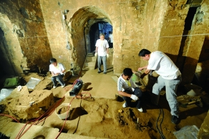 考古人员在河南安阳曹操高陵考古现场清理(2010年6月12日摄)。新华社发