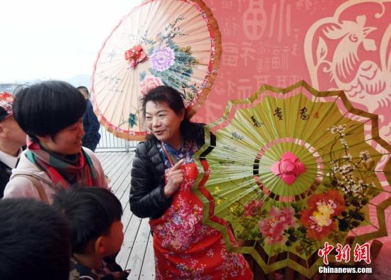 资料图:来自台湾高雄市油纸伞制作艺人向市民展示她的油纸伞作品。刘可耕摄