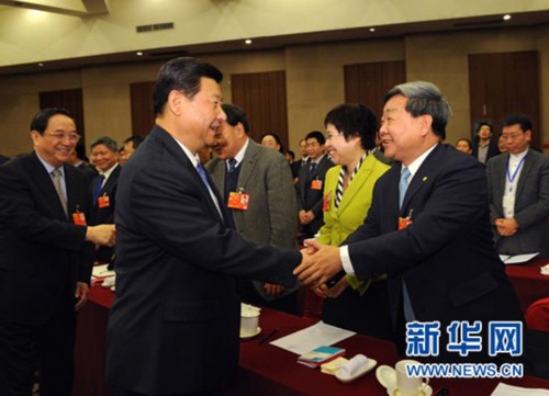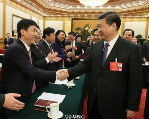 2016年3月4日下午,中共中央总书记、国家主席、中央军委主席习近平看望参加全国政协十二届四次会议的民建、工商联委员,并参加联组会,听取委员们意见和建议。中共中央政治局常委、全国政协主席俞正声参加看望和讨论。新华社记者兰红光摄