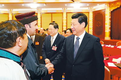 2013年3月9日,中共中央总书记、中共中央军委主席习近平参加十二届全国人大一次会议西藏代表团的审议。这是一位代表向习近平献上哈达。 新华社记者马占成 摄