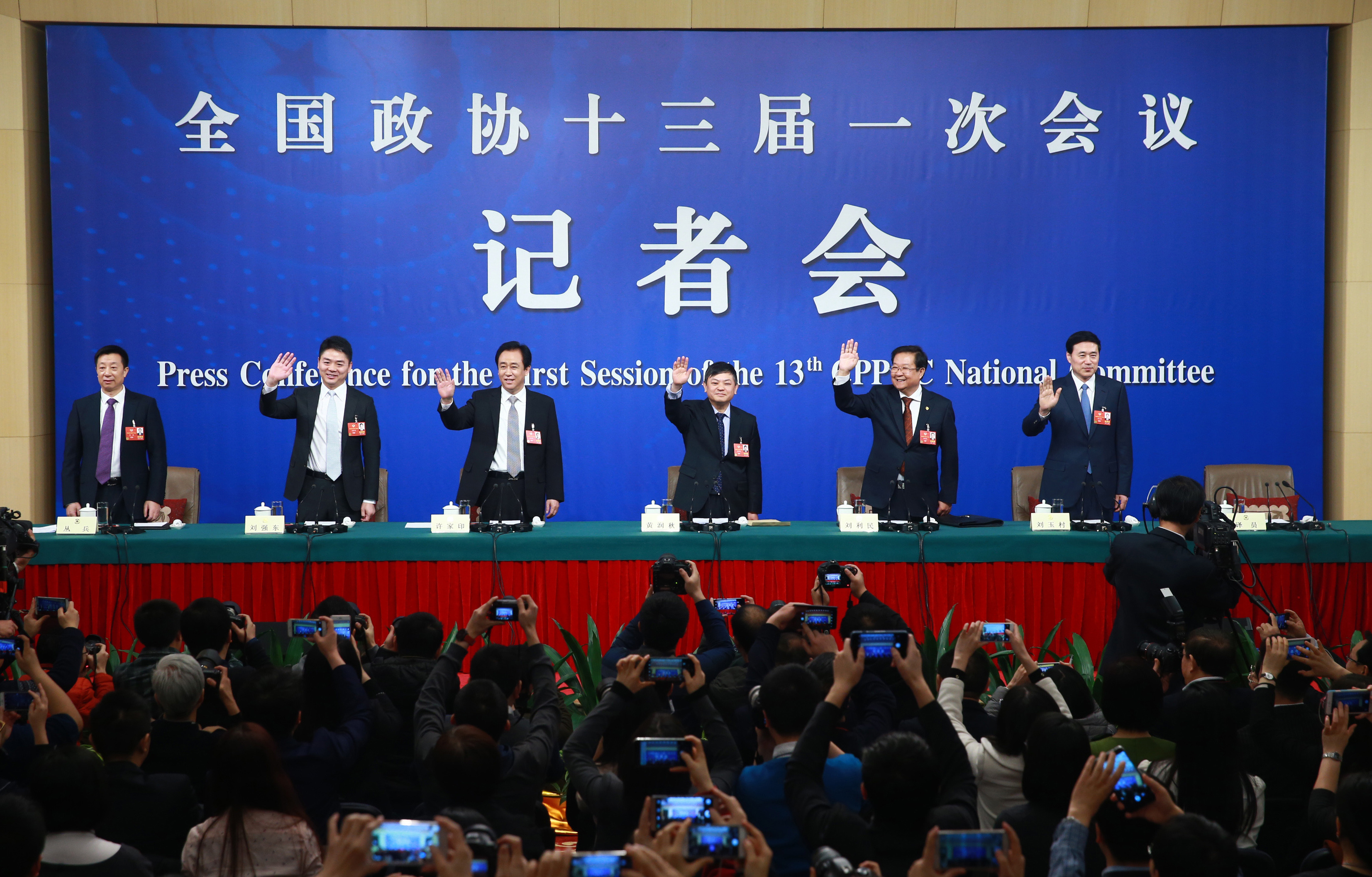3月10日,全国政协十三届一次会议新闻中心举行记者会,邀请全国政协委员黄润秋、刘利民、许家印、刘玉村、刘强东谈提高保障和改善民生水平。这是黄润秋(右三)、刘利民(右二)、许家?。ㄗ笕⒘跤翊澹ㄓ乙唬?、刘强东(左二)向记者挥手致意。新华社记者 邢广利 摄
