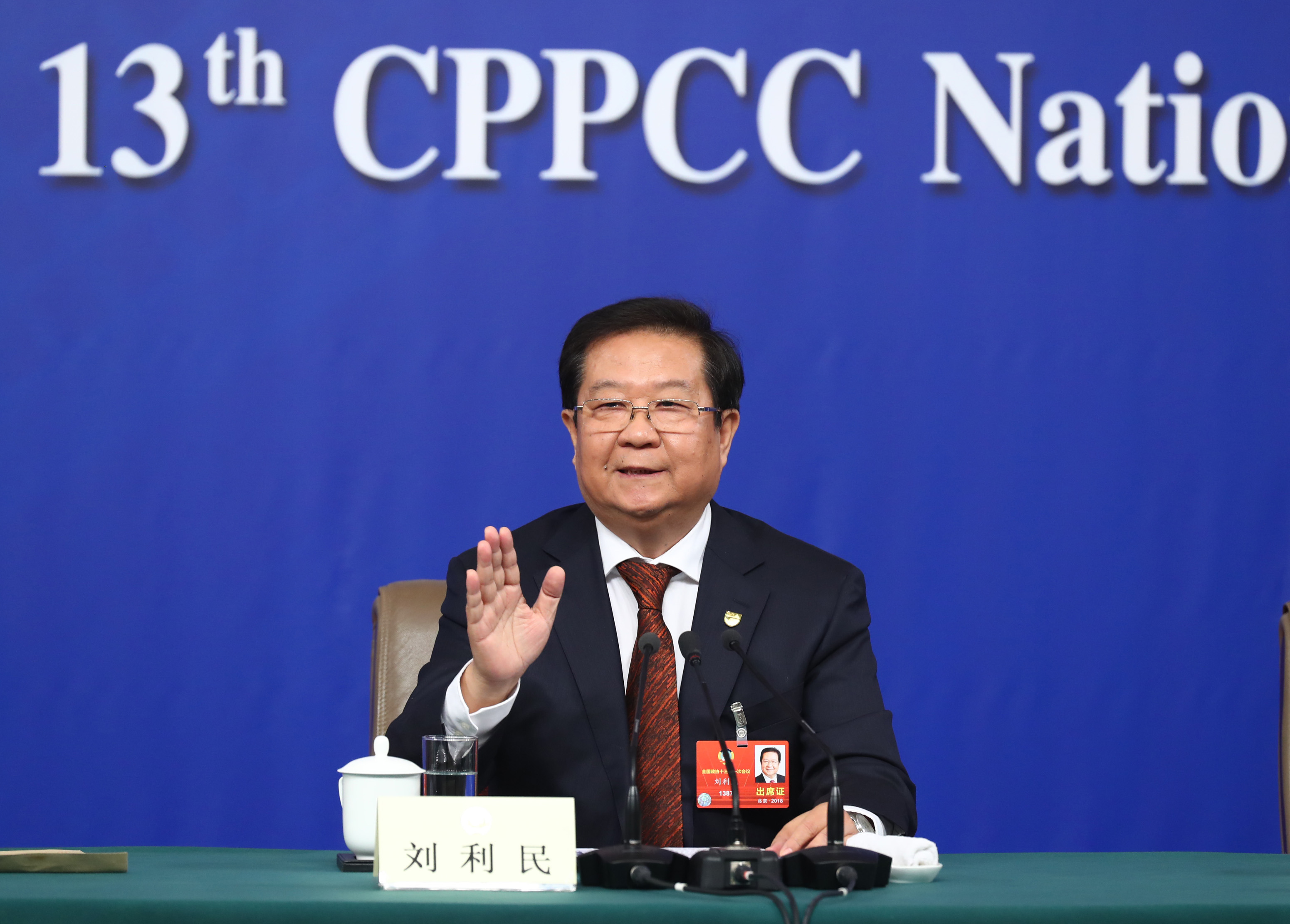 3月10日,全国政协十三届一次会议新闻中心举行记者会,邀请全国政协委员黄润秋、刘利民、许家印、刘玉村、刘强东谈提高保障和改善民生水平。这是刘利民在回答记者提问。新华社记者 邢广利 摄