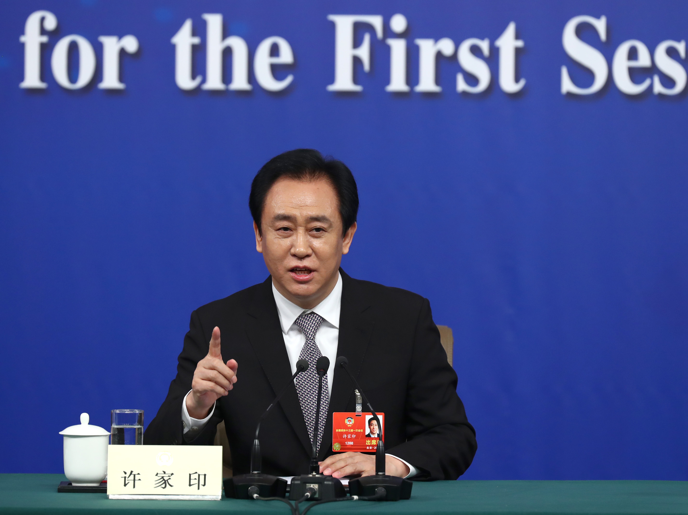 3月10日,全国政协十三届一次会议新闻中心举行记者会,邀请全国政协委员黄润秋、刘利民、许家印、刘玉村、刘强东谈提高保障和改善民生水平。这是许家印在回答记者提问。新华社记者 邢广利 摄