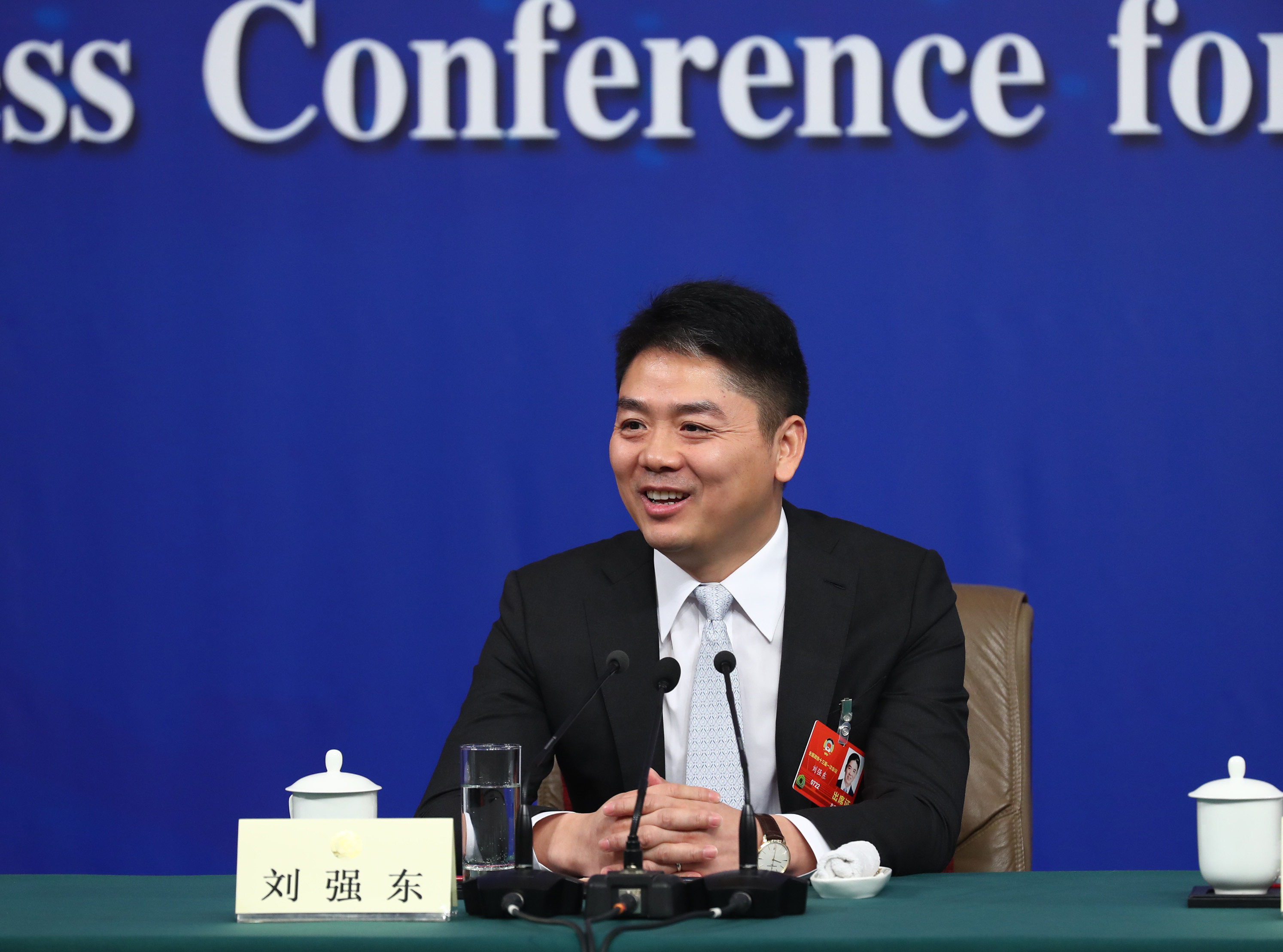 3月10日,全国政协十三届一次会议新闻中心举行记者会,邀请全国政协委员黄润秋、刘利民、许家印、刘玉村、刘强东谈提高保障和改善民生水平。这是刘强东在回答记者提问。新华社记者 邢广利 摄