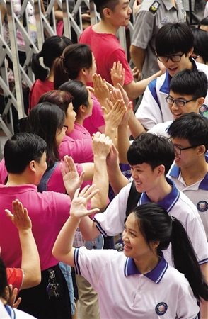 老师与学生击掌加油(资料图片)。广州日报全媒体记者黎旭阳摄