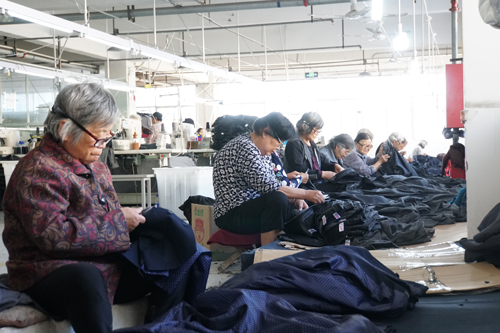 河南沈丘县永盛服饰有限公司车间内,在家闲不住的老人们到车间打零工,挣点零花钱