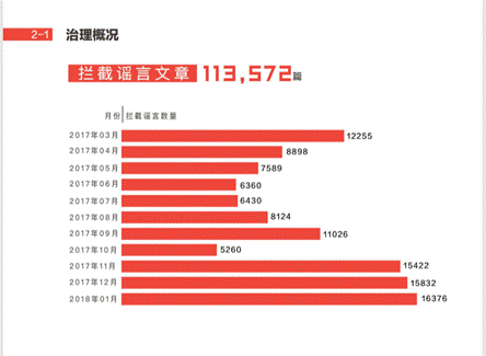 从2017年3月至2018年1月,今日头条国内产品中拦截谣言113572篇,一篇谣言文章最短只需要60秒即可被拦截。因发布不实信息,3212个账号遭到封禁、扣分、禁言等处罚。