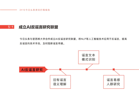 除了禁封传播谣言的账号之外,今日头条还建立反谣言的长效机制,发挥技术优势打造反谣言联盟,强化社会责任。在2017年,今日头条与美国密西根大学合作成立AI反谣言研究联盟,将NLP等人工智能技术应用于反谣言,提高反谣言的技术手段,及时阻断谣言传播。