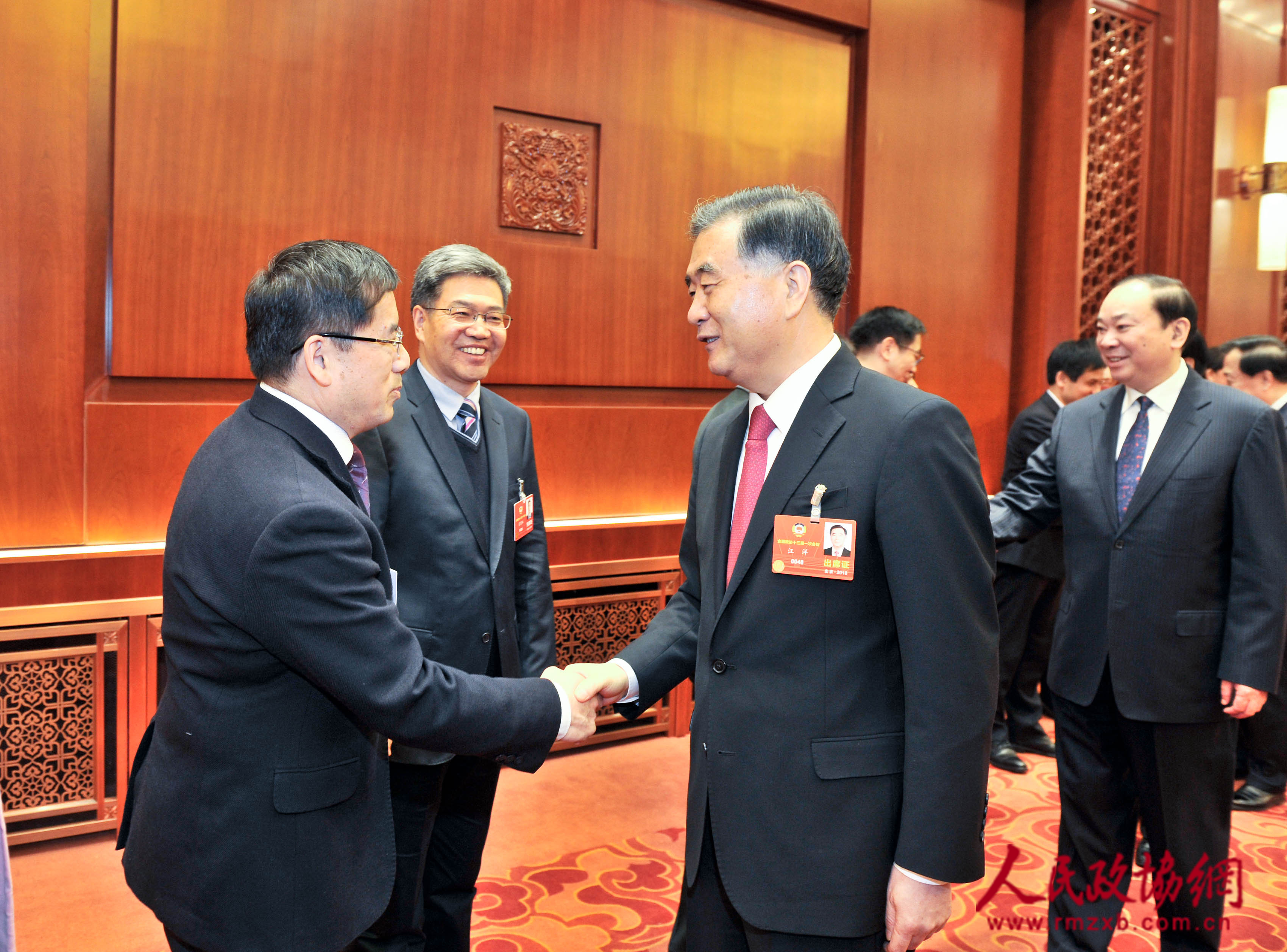 中共中央政治局常委、全国政协主席汪洋3月15日上午在人民大会堂看望了参加全国政协十三届一次会议新闻报道工作的中央主要新闻媒体负责同志和编辑记者代表,向参加大会报道的新闻工作者表示诚挚慰问和衷心感谢。这是汪洋接见人民政协报社党组书记、总编辑周北川。人民政协报●人民政协网 记者 姜贵东 摄