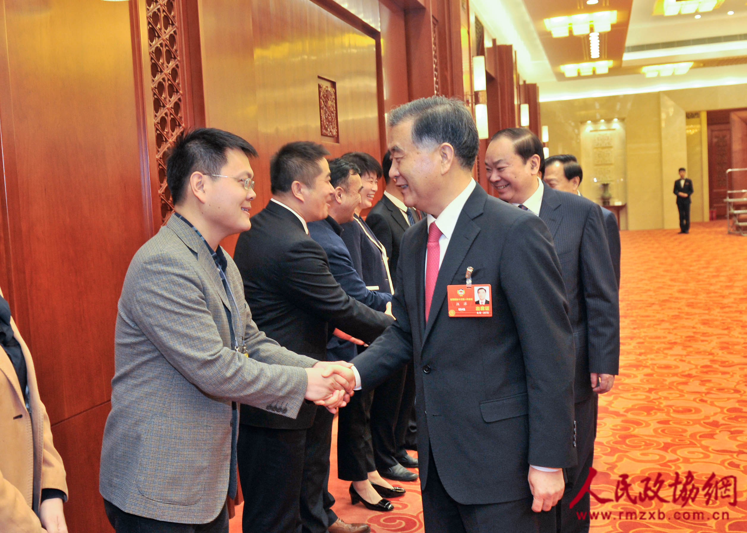 中共中央政治局常委、全国政协主席汪洋3月15日上午在人民大会堂看望了参加全国政协十三届一次会议新闻报道工作的中央主要新闻媒体负责同志和编辑记者代表,向参加大会报道的新闻工作者表示诚挚慰问和衷心感谢。这是汪洋和人民政协报记者李木元亲切握手。人民政协报●人民政协网 记者 姜贵东 摄